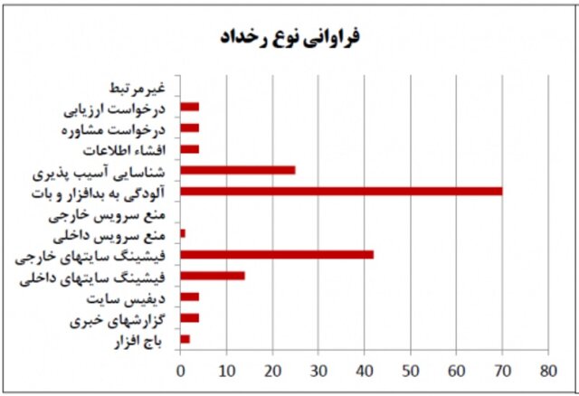 طبق این اطلاعات، بیشترین فراوانی رخداد به ترتیب مربوط به آلودگی به بدافزار و بات، فیشینگ سایتهای خارجی، شناسایی آسیبپذیری، فیشینگ سایتهای داخلی، گزارشهای خبری، دیفیس سایت، درخواست مشاوره، درخواست ارزیابی، افشای اطلاعات، باجافزار و منع سرویس داخلی بوده است.