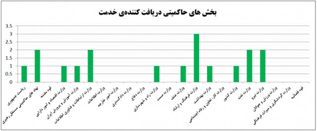 در نمودار بخشهای حاکمیتی دریافتکننده خدمات از مرکز ماهر هم وزارت فرهنگ و ارشاد درصدر و به دنبال آن وزارت ارتباطات و فناوری اطلاعات، وزارت نیرو، وزارت نفت و پس از آن وزارت کشور، وزارت بهداشت، وزارت عتف، وزارت راه و شهرسازی، وزارت آموزش و پرورش و وزارت اقتصاد و امور دارایی قرار دارد.