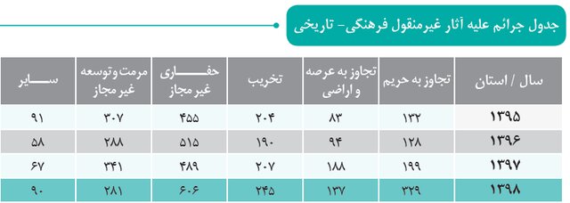 میزان تجاوز به حریم آثار غیرمنقول یا بناها و محوطه‌های تاریخی هم در سال ۹۸ بیشتر شده و به عدد ۳۲۹ رسیده، درحالی که ۱۹۹ مورد تجاوز به حریم در سال ۹۷ ثبت شده است.