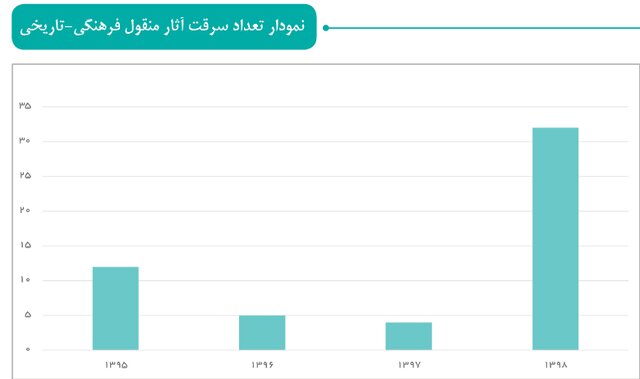 اما در ارتباط با جرایم علیه آثار منقول ـ هـر شـیء تـاریخـی، فرهـنگـی و هـنری کـه قـابلـیـت نقـل و انـتقـال دارد ـ، سرقت و قاچاق اموال تاریخی در سال ۹۸ افزایش قابل تأملی داشته است. طبق اطلاعات همین سالنامه آماری (۹۸)، ۳۲ مورد سرقت آثار تاریخی شناسایی شده، درحالی که سال ۹۷ تعداد سرقت‌های ثبت‌شده چهار مورد بوده است.