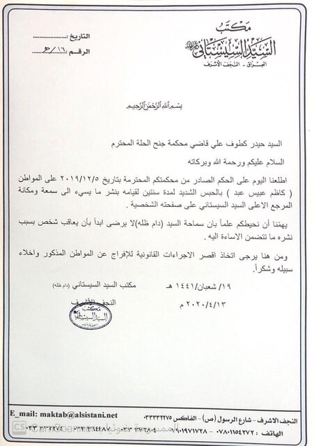 مرجعیت عالی‌قدر شیعیان عراق از دستگاه قضایی این کشور خواست فردی را که به اتهام اهانت به ایشان محکوم به حبس شده است، آزاد کند.