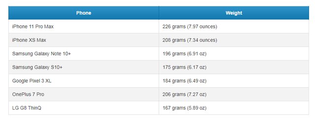 بر اساس اعداد و ارقام ذکر شده در جدول بالا، نخستین گوشی سنگین وزن آیفون ۱۱ پرو مکس است که ۲۲۶ گرم وزن دارد. بعد از آن، نسل پیشین آن یعنی گوشی آیفون ایکس اس مکس قرار گرفته است که ۲۰۸ گرم دارد و سپس وان پلاس ۷ پرو با ۲۰۶ گرم وزن در جایگاه سوم جای گرفته است (اعداد و ارقام این جدول به ترتیب وزن گوشیهای هوشمند ذکر نشده است).