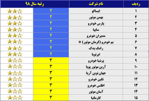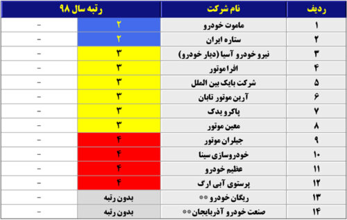 شرکتهای ریگان خودرو و صنعت خودرو آذربایجان به دلیل عدم وجود اطلاعات در خصوص برخی از شاخصهای ارزیابی، حائز رتبه و مشمول رده بندی نگردیدهاند.