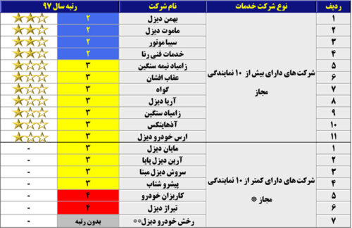 همچنین رتبه خدمات پس از فروش شرکتهای عرضه کننده خودرو سبک (دارای کمتر از ۱۰ نمایندگی مجاز) نیز مطابق جدول به شرح زیر است: