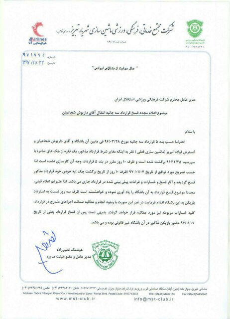 به گزارش صلح خبر، باشگاه ماشین سازی مدعی شده که “با توجه به عدم پایبندی تیم استقلال و داریوش شجاعیان به تعهدات خود بر اساس قرارداد سه جانبه این بازیکن بهطور غیرقانونی در تیم استقلال بازی میکند. “