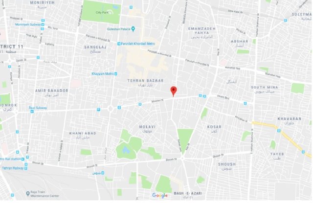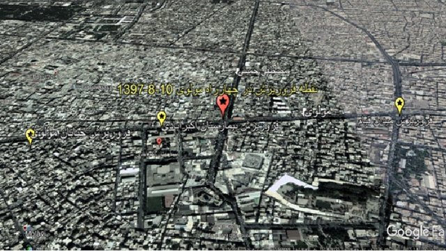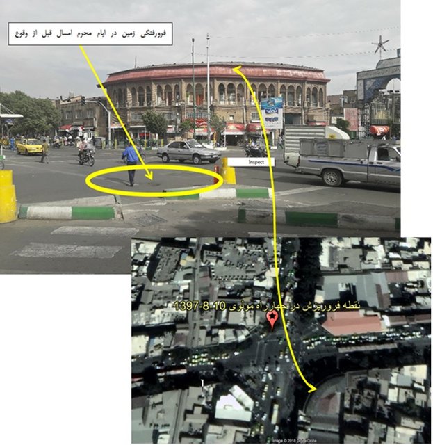 به گفته این محقق در تصویر ذیل موقعیت نقطه فروریزش در نقشه شهری تهران که برگرفته از نقشه گوگل است، محل حادثه تقاطع مولوی با خیابان مصطفی خمینی را نشان میدهد.
