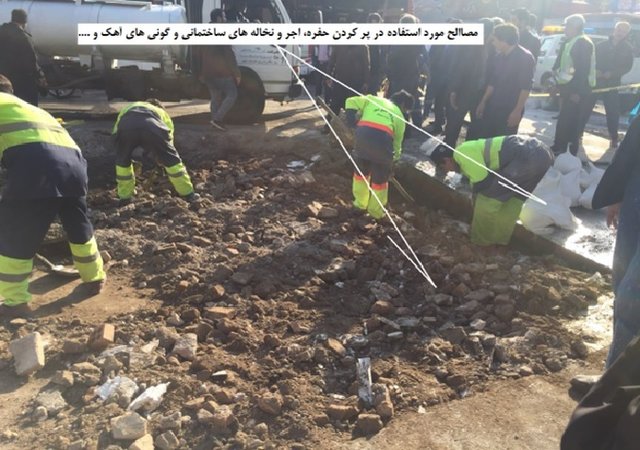 وی ادامه داد: در بازدید میدانی، مشاهده شد با استفاده از آجر، نخالههای ساختمانی، خاک و چند گونی آهک، حفرهای به ابعاد ۵ در ۵ متر و به عمق ۸ متر پر شده است. مسلما، مصالح استفاده شده، مناسب چنین عملیاتی نیست و احتمال دارد در آینده نیز در اثر تحکیم و یا آب شستگی، مجددا نشست و یا فروریزش زمین رخ دهد. از این رو ضرورت دارد تا نکات فنی الزامی در اجرا رعایت شود. در عکسهای ذیل نمونه پر کردن حفره چهار راه مولوی به تصویر کشیده شده است.