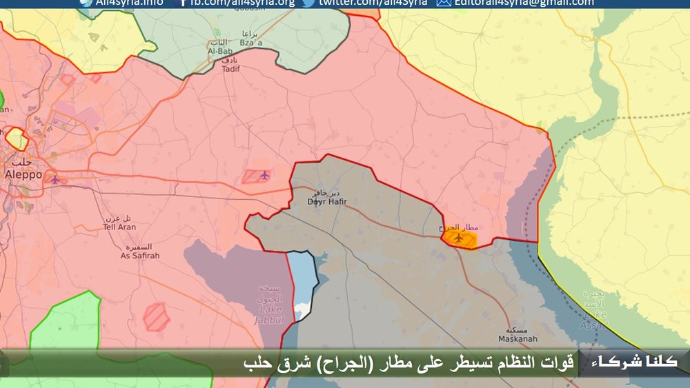به گزارش ایسنا، به نقل از شبکه خبری الجزیره، منابع سوری اعلام کردند که نیروهای دولتی این کشور توانستند در ادامه عملیات خود علیه داعش در حومه حلب، کنترل کامل فرودگاه نظامی الجراح در حومه شرقی و تعدادی از روستاهای اطراف آن را در دست بگیرند.