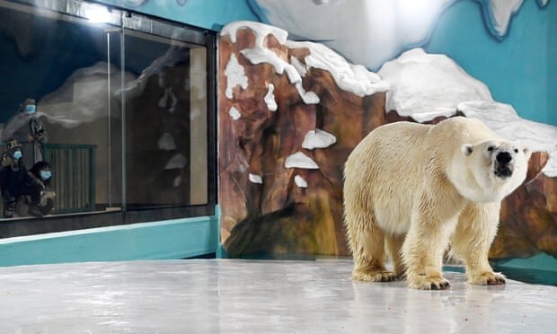 در یک ویدئو نشان داده میشود در فضایی که با استفاده از تکههای یخ و سنگهای مصنوعی ساخته شده و کفپوش آن هم به رنگ سفید رنگآمیزی شده است، خرسهای قطبی که از گونههای در خطر انقراض هستند، سوژه عکاسی گروهی از میهمانان شدهاند.
