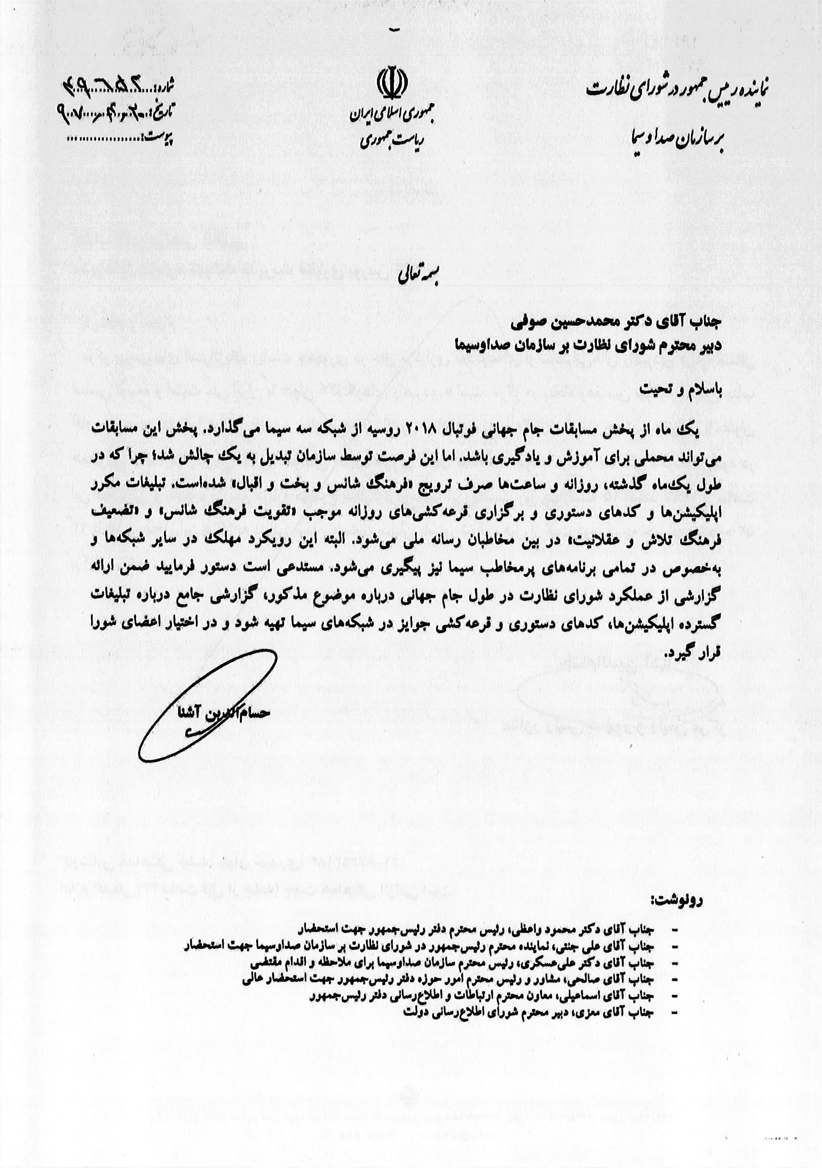 «پیرو مباحث مطرح شده در خصوص مسابقات و جوایز تلویزیونی و حضور گسترده خدمات ارزش افزوده (Value Added Service) یا همان ستاره مربعها در برنامههای مختلف صداوسیما به اطلاع میرساند حسامالدین آشنا نماینده رئیسجمهور در شورای نظارت بر صداوسیما در خصوص این موضوعات طی سه نامه با دبیرخانه شورای نظارت بر صداوسیما مکاتبه داشته و خواستار تهیه گزارش توسط «مدیریت نظارت اجرایی» شورا و طرح و بررسی این موضوع در جلسه اعضا شده است.