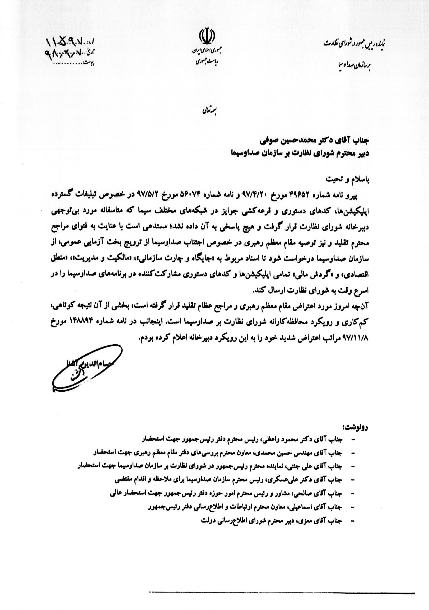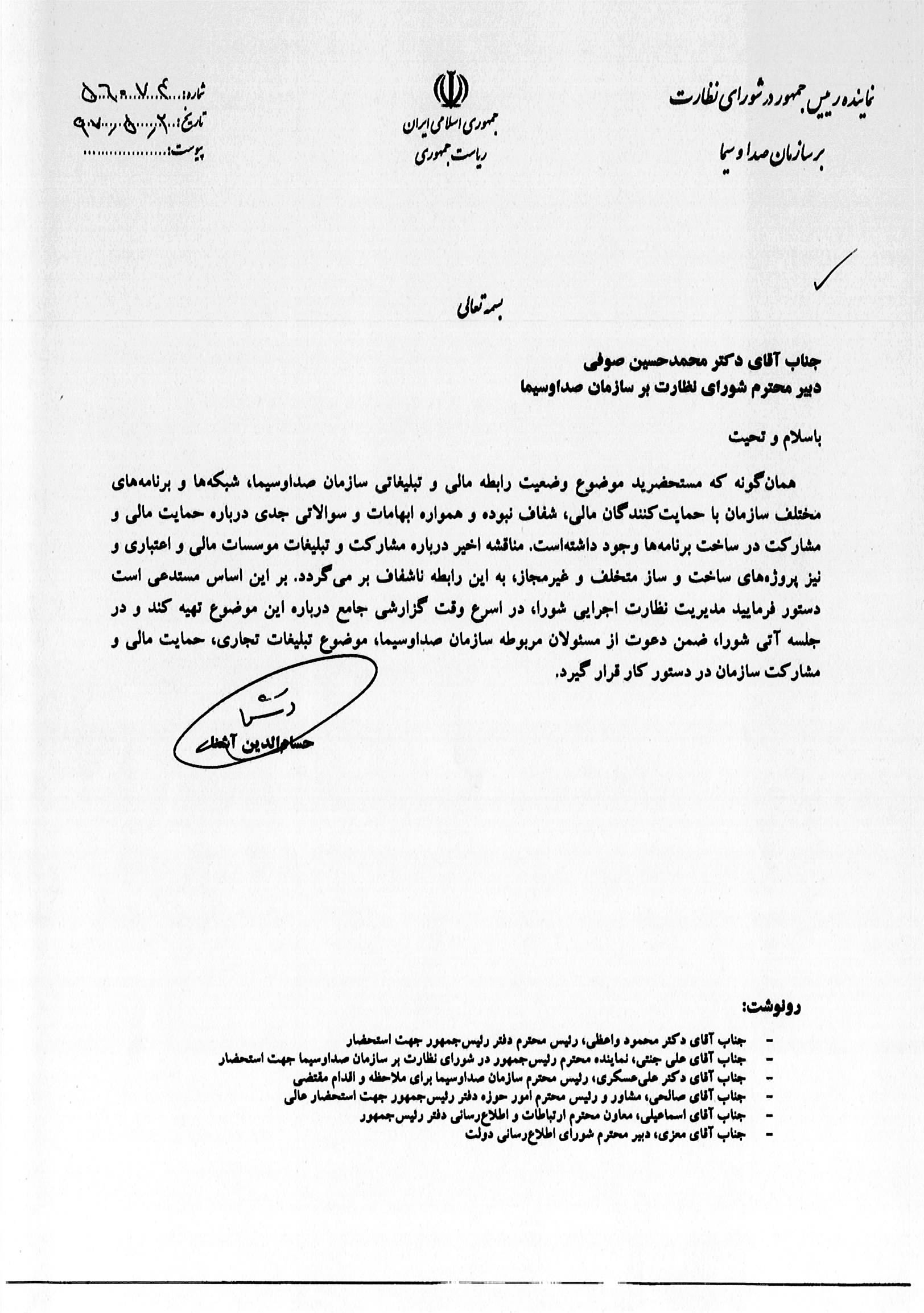 تصویر مکاتبات نماینده قوه مجریه در شورای نظارت با دبیرخانه شورا و سازمان صداوسیما با هدف نظارت همگانی، حکمرانی مشارکتی و ارتقای شفافیت منتشر میشود.»