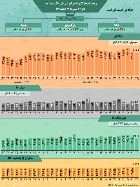 طبق اعلام وزارت بهداشت، ویروس کرونا تا ظهر جمعه (۲۲ اسفند ۹۹) یک میلیون و ۷۳۱ هزار و ۵۵۸ نفر را در ایران به طور قطعی مبتلا کرده و در مجموع تا این روز ۶۱ هزار و ۶۹ نفر را به کام مرگ کشانده است. از سوی دیگر، یک میلیون و ۴۷۷ هزار و ۵۸۸ نفر در ایران تاکنون بهبود یافتهاند. بررسی آمارهای وزارت بهداشت نشان میدهد که طی ۱۰ روز اخیر (۱۳ تا ۲۲ اسفند) به طور متوسط در هر ساعت حدود ۳۴۷ نفر در ایران مبتلا و بین ۳ تا ۴ نفر قربانی این ویروس شدهاند. البته در هر ساعت حدود ۲۸۰ نفر نیز بهبود یافتهاند. در این اینفوگرافیک روند شیوع کرونا در ایران طی یک ماه اخیر (از ۲۲ بهمن تا ۲۲ اسفند) را مشاهده میکنید.