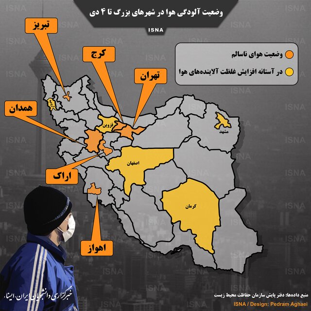 دفتر پایش سازمان حفاظت محیط زیست، میزان نسبی آلودگی هوا در ایران به تفکیک هر شهر را مشخص کرده است. برخی از این شهرها از جمله پایتخت، در وضعیت هوای ناسالم هستند و بعضی دیگر در آستانه افزایش غلظت آلایندههای هوا قرار دارند. در این اینفوگرافیک اسامی شهرهای آلوده یا در معرض افزایش آلودگی تا روز چهارم دیماه مشخص شده است.