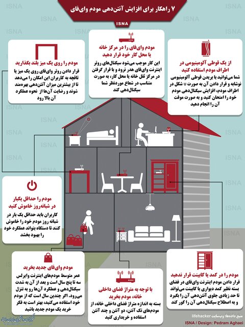 یکی از عواملی که موجب میشود کاربران از آنتندهی و سیگنالدهی مودم و روترهای اینترنت بیسیم وایفای رضایت کافی نداشته باشند، قرار دادن آنها در فضای نامناسب است. بسیاری از کارشناسان فعال در این حوزه، به کاربران پیشنهاد میکنند برای افزایش آنتندهی مودم، آن را همواره روی جایگاه بلندی قرار دهند تا سیگنالهای صادره از مودم برد بیشتری در فضا داشته باشند. آنها به کاربران توصیه میکنند نکات مهمی را در نظر داشته باشند تا رضایت خود از نحوه عملکرد مودمهای وایفای را بالا ببرند. در اینفوگرافی پیش رو به برخی از این موارد اشاره شده است.