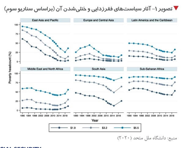 همانگونه که در تصویر فوق دیده می شود، درحالی که سیاستهای فقرزدایی تا سال ۲۰۱۸ در مناطق مختلف جهان موفق به کاهش فقر شده بود، برآوردها حاکی از آن است که همه گیری ویروس باعث افزایش ناگهانی مجدد فقر خواهد شد.