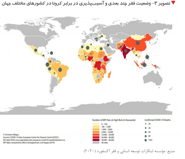 براساس گزارش مؤسســه ابتکارات توسعه انسانی و فقر آکسفورد که امسال منتشر شده و براساس پایگاه داده جهانی، برای سال گذشته، وضعیت جمعیت ۱۰۱ کشور برابر با ۵.۷ میلیارد نفر در جهان در حال توسعه را در مواجهه با کرونا بررســی کرده اســت. شاخص فقر چندبعدی جهانی پنج میلیارد و ۷۰۰ میلیون نفر را در بر میگیرد که ۹۱ درصد آن در منطقه در حال توسعه ساکن هستند.