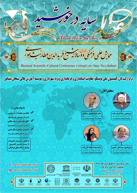 به گزارش صلح خبر به نقل از روابط عمومی کمیسیون ملی یونسکو-ایران، با مشارکت این کمیسیون و به همت معاونت استانداری و فرمانداری ویژه، شهرداری و مؤسسه آموزش عالی سبحان نیشابور همایش علمی– فرهنگی (مجازی) دوسالانه شیخ فریدالدین عطار نیشابوری ۲۰ فروردین ۱۴۰۰ از ساعت ۲۱ تا ۲۲:۳۰، در بستر فضای مجازی: (https://www.skyroom.online/ch/sobhan۹۶۳۸۵۲/sayehdarkhorshid) برگزار خواهد شد.