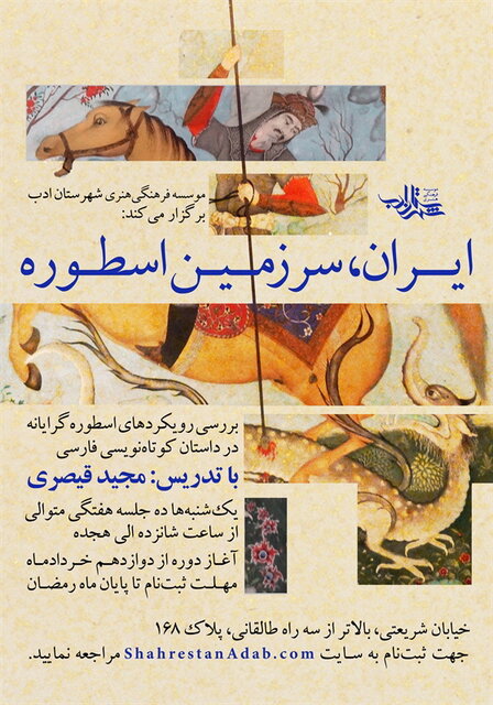 کارگاه «ایران، سرزمین اسطوره» از آغاز خرداد ۹۸، روزهای یکشنبه از ساعت ۱۶ تا ۱۸ برگزار خواهد شد. علاقهمندان به شرکت در این جلسات میتوانند با مراجعه به سایت مؤسسه فرهنگی هنری شهرستان ادب به نشانی Shahrestanadab.com ثبتنام کنند.