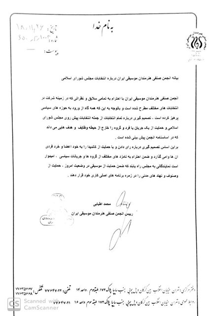 بر این اساس تصمیمگیری درباره رای دادن و یا حمایت از کاندیداها را به خود اعضا و خرد فردی آنها وا میگذارد و ضمن احترام به نامزدهای مختلف از گروهها و جریانات سیاسی، امیدوار است نمایندگانی به مجلس راه یابند که ضمن حمایت از موسیقی در وضعیت امروز، حمایت از صنوف و نهادهای مدنی را در زمره برنامههای اصلی کاری خود قرار دهند.»