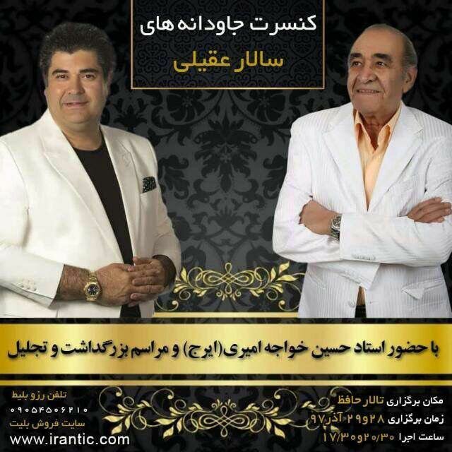 «کنسرت جاودانههای سالار عقیلی» روزهای چهارشنبه و پنجشنبه (۲۸ و ۲۹ آذرماه) ساعت ۱۷:۳۰ و ۲۰:۳۰ در تالار حافظ شهر شیراز به روی صحنه میرود.