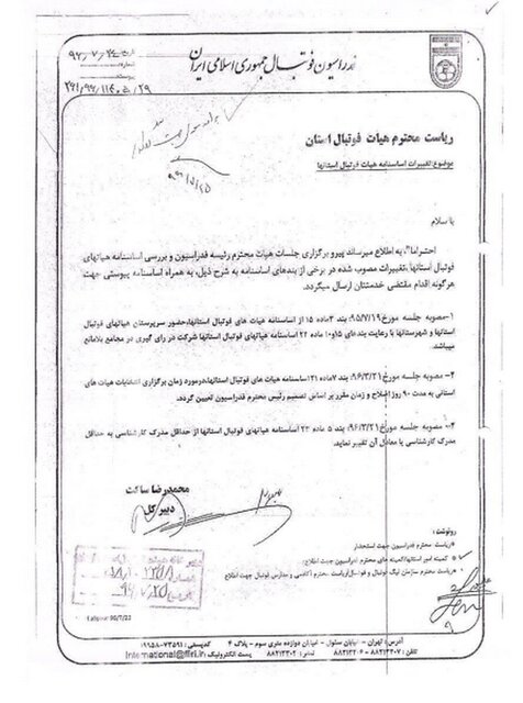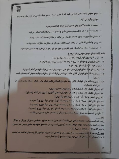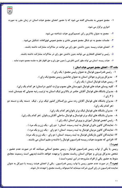 ۱- آخرین اساسنامه هیاتهای فوتبال استانها و اصلاحیه آن متعلق به ۹۶/۰۷/۲۴ است که در تاریخ ۹۶/۰۷/۲۵ به هیاتهای فوتبال استانها با امضای دبیرکل فدراسیون ابلاغ شده و به عنوان مرجع به آن استــناد میشود. مهمترین مادهای که در خصوص موضوع برگزاری انتخابات هیات فوتبال گیلان است تبصره ۱ و ۲ ماده ۱۴ اساسنامه فوق است.