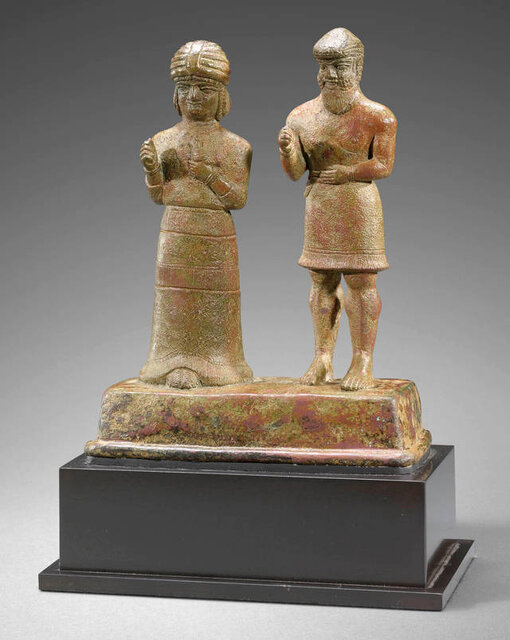 این ریختهگری باشکوه برنزی به دوران ایلام میانه (۱۵۰۰ تا ۱۱۰۰ قبل از میلاد) مربوط است. زوجی که روی یک ازاره ایستادهاند و لباسهای فاخری پوشیدهاند، که احتمالا پادشاه و ملکه باشند. حالت آنها نشان میدهد که عبادت میکنند. این پیکرکهای کوچک احتمالا از کاوشهای فرانسویها در شوش بدست آمدهاند که اکنون از مجموعه ساریخانی برای این نمایشگاه به امانت گرفته شده است.
