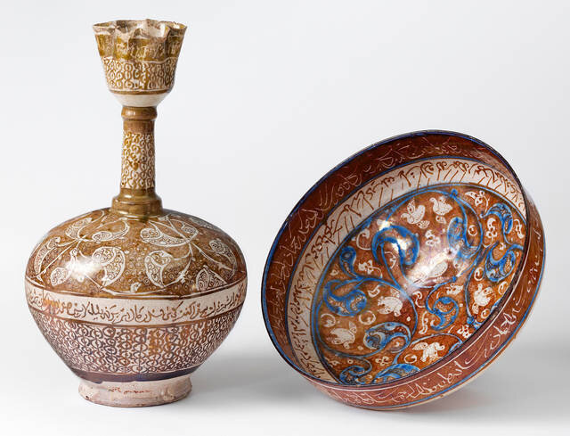 بطری و کاسهای مزین به شعر فارسی متعلق به ۱۱۸۰ – ۱۲۲۰ میلادی که در موزه ویکتوریا و آلبرت لندن نگهداری میشود.