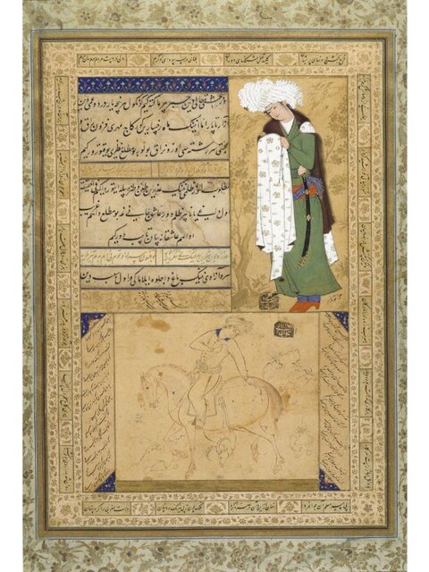 یک نسخه دستنویسی شده متعلق به قرن هفدهم میلادی با نقشی از یک شکارچی سوار و جوانی ایستاده با لباسهایی فاخر به همراه اشعاری به زبان فارسی که در اطراف صفحه شعرهایی از سعدی مشاهده میشود. این نسخه هماینک در موزه ویکتوریا و آلبرت لندن نگهداری میشود.