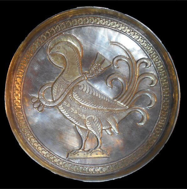 این ظرف نقره ای ( ۵۰۰ تا ۷۵۰ میلادی) متعلق به دوره ای است که ساسانیان در ایران حکومت می کردند. تصویری از یک قرقاول با هاله ای در گرداگر آن و آویزی که به پرنده آویخته شده و نماد پادشاهان آن دوره بوده است.