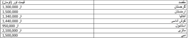 جدول زیر گویای قیمت تورهای خارجی در مسیرهای پر تردد است که در ادامه تعطیلات نوروز با افت روبرو شده؛ هرچند که بررسی در وضعیت خدمات این تورها نشان میدهد کیفیت آنها چندان بالا نیست و تورهایی که به نسبت، خدمات با کیفیتتری دارند با کاهش جزئی در قیمت مواجه شدهاند که چندان تفاوتی در نرخ نکردهاند.