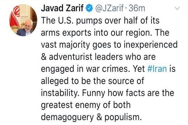 «آمریکا بیش از نیمی از صادرات تسلیحاتی خود را به منطقه ما سرازیر می کند. بیشتر این تسلیحات به دست رهبران بی تجربه و ماجراجویی می افتد که در ارتکاب به جنایات جنگی دست دارند؛ هنوز ایران متهم است که منبع بی ثباتی است. جالب اینجاست که حقایق بزرگترین دشمن عوامفریبی و پوپولیسم است.»