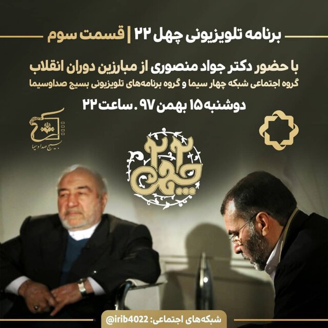 به گزارش صلح خبر به نقل از روابط عمومی شبکه چهار، سومین قسمت از ویژه برنامه دهه فجر شبکه چهار سیما با عنوان «چهل ۲۲»، امشب (۱۵ بهمن ماه) میزبان جواد منصوری فعال انقلابی و اولین فرمانده سپاه میشود.