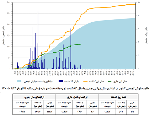 نگاهی گذرا به شکل زیر که از آخرین اطلاعات سازمان هواشناسی کشور بدست آمده است، به خوبی شرایط خشکسالی سال زراعی جاری را نمایان می کند. در این شکل بخش آبی رنگ، معرف میانگین بلندمدت بارش تجمعی کشور است. منحنی های قهوه ای و سبز رنگ به ترتیب تغییرات بارش تجمعی سال آبی گذشته و جاری را نمایش می دهند. مقایسه منحنی سبز رنگ با منحنی قهوه ای و بخش آبی رنگ بیانگر وقوع کاهش چشمگیر بارش سال زراعی جاری(۴۱/۲- درصد در کل کشور) نسبت به بلندمدت و سال زراعی گذشته است.