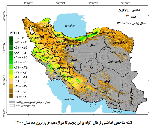 به منظور آگاهی از شرایط فعلی وقوع خشکسالی در اراضی کشاورزی، جنگلها و مراتع کشور، دقت در نقشه شاخص تفاضلی نرمال گیاه می تواند راهگشا باشد. در این نقشه طیف رنگ زرد به طرف قهوهای روشن و تیره نشانگر افزایش تنش خشکی و برعکس طیف رنگ سبز روشن به طرف رنگ سبز تیره نمایانگر وقوع شرایط بالای معمول و بهینه به لحاظ سبزینگی گیاه است. همانگونه که در این نقشه ملاحظه می شود، بخش های قابل توجهی از کشور شامل استان های خراسان رضوی و شمالی، آذربایجان شرقی و غربی، زنجان، مرکزی، همدان، کردستان، فارس و چهار محال و بختیاری با کاهش شدید سبزینگی در اراضی کشاورزی و منابع طبیعی مواجه هستند. این وضعیت زمانی بحرانی تر به نظر می رسد که از طرفی کاهش حدود ۸۵ درصدی بارش فصل بهار( که نقش حیاتی برای محصولات دیم دارد) نسبت به بلندمدت را مورد توجه قرار دهیم و دقت کنیم که با حرکت به طرف فصل گرم و افزایش دما و تبخیر و به دنبال آن کاهش رطوبت خاک، این تنش خشکی افزایش می یابد و به تدریج غالب عرصه های کشاورزی، جنگلها و مراتع کشور در سال زراعی جاری با خشکسالی مواجه خواهند شد.