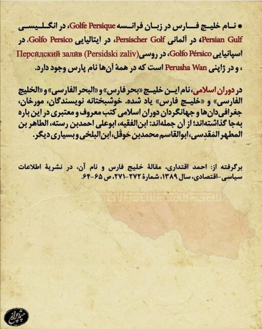 احمد اقتداری در مقاله «خلیج فارس و نام آن» که در نشریه اطلاعات سیاسی – اقتصادی (سال ۱۳۸۹، شماره ۲۷۱ _۲۷۲ صفحه، ۶۴- ۶۵) منتشر شده نوشته است: