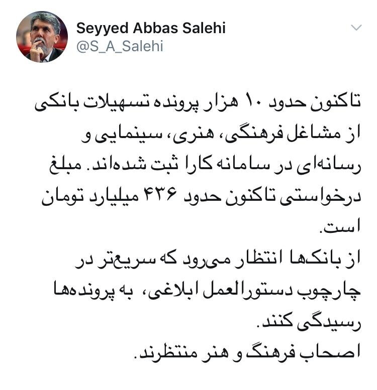وزیر فرهنگ و ارشاد اسلامی در صفحه شخصی توئیتر خود با اشاره به ثبت نام اهالی فرهنگ، هنر و رسانه در سامانه کارا نوشت: از بانکها انتظار میرود که سریعتر در چارچوب دستورالعمل ابلاغی، به پروندهها رسیدگی کنند. اصحاب فرهنگ و هنر منتظرند.