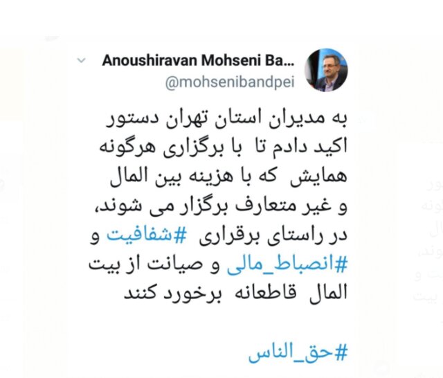 به گزارش صلح خبر، انوشیروان محسنیبندپی -استاندار تهران- با انتشار توئیتی اعلام کرد: «به مدیران استان تهران دستور اکید دادم تا با برگزاری هر گونه همایش که با هزینه بیتالمال و غیر متعارف برگزار میشوند، در راستای برقراری شفافیت و انضباط مالی و صیانت از بیتالمال قاطعانه برخورد کنند.