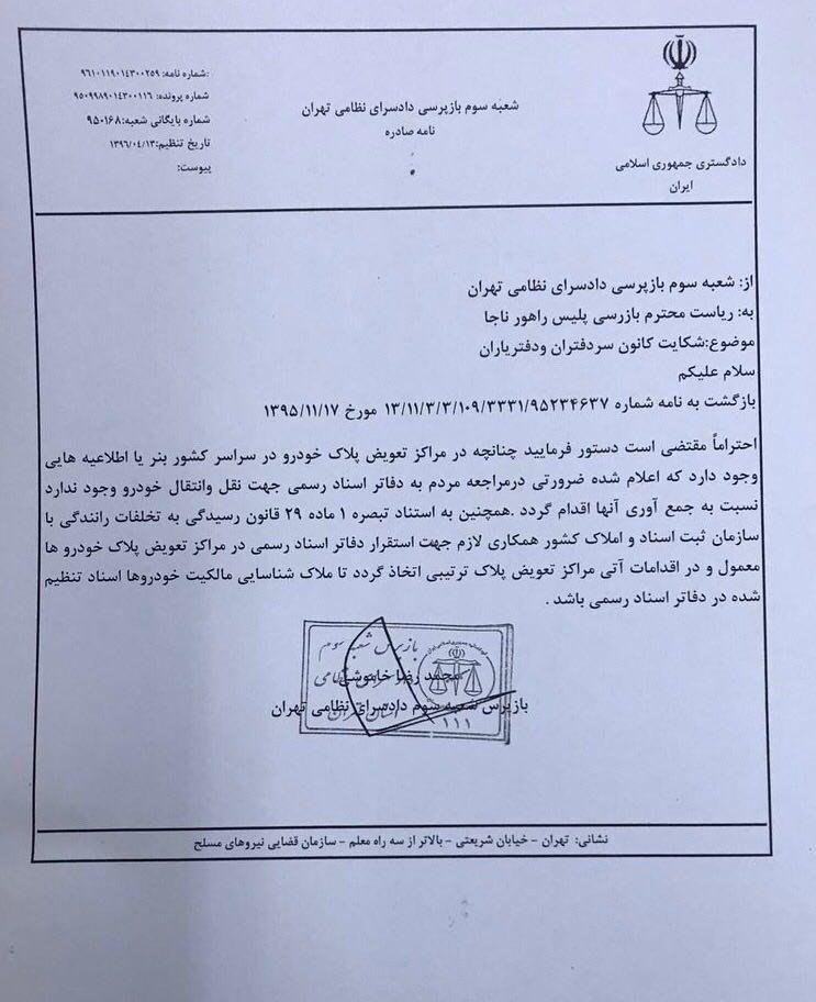 احتراماً مقتضی است دستور فرمایید چنانچه در مراکز تعویض پلاک خودرو در سراسر کشور بنر یا اطلاعیه هایی وجود دارد که اعلام شده ضرورتی در مراجعه مردم به دفاتر اسناد رسمی جهت نقل و انتقال خودرو وجود ندارد نسبت به جمع آوری آنها اقدام گردد. همچنین به استناد تبصره ۱ ماده ۲۹ قانون رسیدگی به تخلفات رانندگی با سازمان ثبت اسناد و املاک کشور همکاری لازم جهت استقرار دفاتر اسناد رسمی در مراکز تعویض پلاک خدروها معمول و دراقدامات آتی مراکز تعویض پلاک ترتیبی اتخاذ گردد تا ملاک شناسایی مالکیت خودروها اسناد تنظیم شده در دفاتر اسناد رسمی باشد.