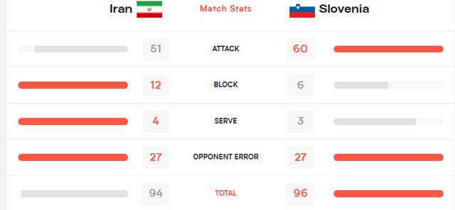 تیم ملی والیبال ایران در این بازی و در حمله ۵۱ امتیاز به دست آورد درحالی که تیم ملی اسلوونی در این بخش به ۶۰ امتیاز دست یافت.