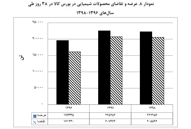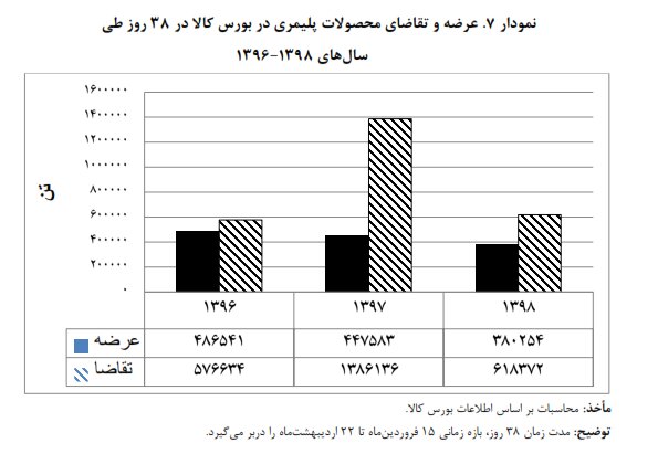بهگزارش صلح خبر، تقاضای محصولات پلیمری در اوایل سال ۱۳۹۷ دچار التهاب بود که بر اساس سیاستهای اتخاذ شده، این مشکل اما تا حد زیادی برطرف شده است؛ از سوی دیگر عرضه محصولات شیمیایی در بازده زمانی مورد بررسی در سال ۱۳۹۸ نسبت به مدت مشابه در سال ۱۳۹۷ تغییری چندانی نداشته و نسبت به مدت مشابه در سال ۱۳۹۶ حدود ۱۳ درصد رشد داشته است. همچنین تقاضا در بازده زمانی مورد نظر در سال جاری نسبت به سال گذشته اندکی کاهش و نسبت به مدت مشابه سال جاری حدود ۲۷ درصد رشد داشته است.
