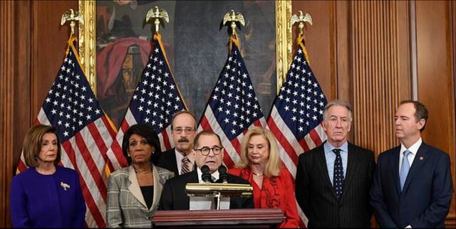به گزارش صلح خبر، جرولد نادلر، رییس کمیته قضایی مجلس نمایندگان در حالی که در کنار نانسی پلوسی، رییس مجلس نمایندگان و روسای پنج کمیته دیگر که در تحقیقات استیضاح دونالد ترامپ، رییس جمهور آمریکا مشارکت دارند، ایستاده بود، اعلام کرد که ترامپ به “جرایم سنگین و خرد” متهم است.