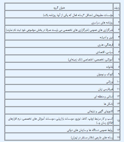 1. مؤسسات مطبوعاتی، روزنامهها، هفتهنامهها، دو هفتهنامهها، ماهنامه ها، دو ماهنامهها، فصلنامهها