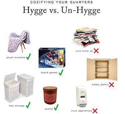 این واژهی دانمارکی را میتوان راحتی و دنجی معنی کرد. زندگی هوگه روش سنتی اسکاندیناویاییها برای دکوراسیون منزل است که پایه و اساس آن فضای داخلی آرام و دلپذیر است که بر مفاهیم انتزاعی مثل رضایت، راحتی، سادگی، روابط و تمدد اعصاب هم اهمیت میدهد.