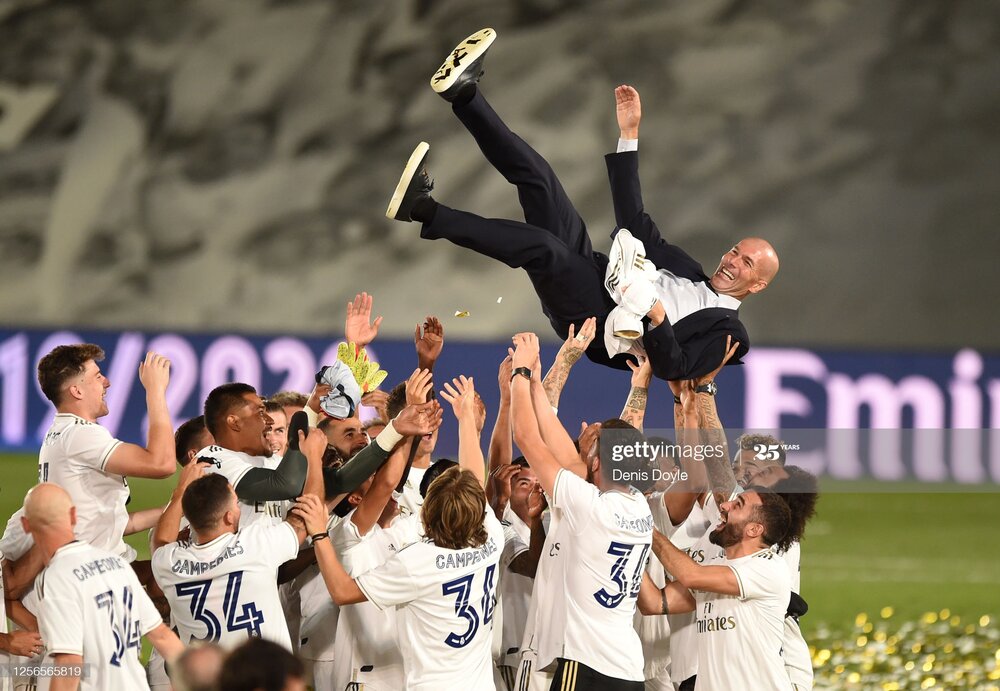 رئال مادرید به خاطر بحران کرونا در ورزشگاه خالی از تماشاگر جشن قهرمانی گرفت. زیدان در مورد جشن هواداران گفت: برای ما عجیب بود اما نمیتوانیم آن را کنترل کنیم. دوست داشتیم در سیبلس (منطقهای در مادرید) باشیم اما به خاطر مساله سلامتی نتوانستیم. آنها این موضوع را میدانند. در خانهشان حضور دارند و از قهرمانی دوباره تیمشان خوشحال هستند.