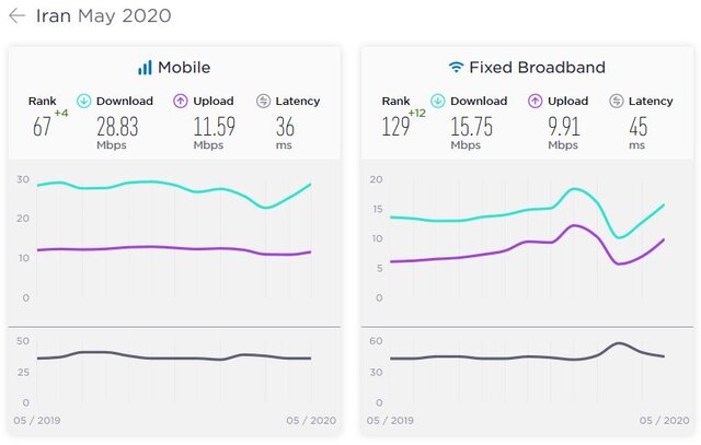 اینترنت موبایل ایران در ماه ژانویه سال ۲۰۲۰ با متوسط سرعت دانلود ۲۷.۵۳ مگابیتبرثانیه در رتبه ۷۰ قرار داشت، در بخش اینترنت پهنباند ثابت نیز ایران با متوسط سرعت دانلود ۱۸.۴۱ مگابیتبرثانیه، جایگاه ۱۲۲ جهانی را کسب کرده بود.