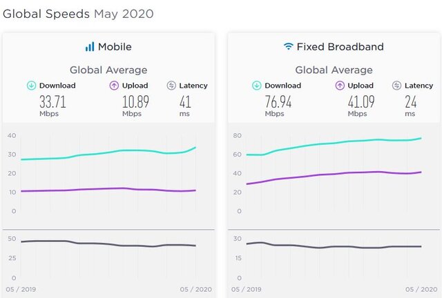 در حال حاضر و طبق آخرین آمار منتشرشده تا ماه می ۲۰۲۰، متوسط جهانی سرعت دانلود اینترنت موبایل، ۳۳.۷۱ مگابیتبرثانیه و متوسط جهانی سرعت آپلود اینترنت موبایل، ۱۰.۸۹ مگابیتبرثانیه است. همچنین در حوزه اینترنت ثابت، متوسط جهانی سرعت دانلود، ۷۶.۹۴ مگابیتبرثانیه و متوسط جهانی سرعت آپلود ۴۱.۰۹ مگابیتبرثانیه است.