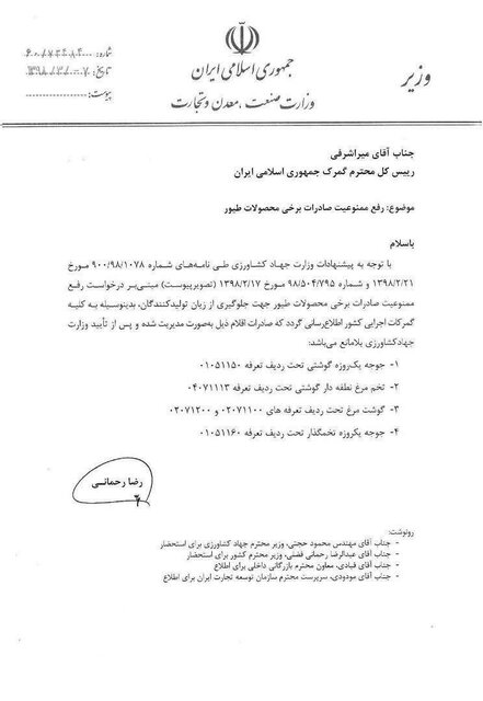 در این ابلاغیه که خطاب به رئیس کل گمرک نوشته شده آمده است که «با توجه به پیشنهادات وزارت جهاد کشاورزی مبنی بر درخواست رفع ممنوعیت صادرات برخی محصولات طیور جهت جلوگیری از زیان تولید کنندگان، بدینوسیله به کلیه گمرکات اجرایی کشور اطلاع رسانی گردد که صادرات اقلام ذیل به صورت مدیریت شده و پس از تأیید وزارت جهاد کشاورزی بلامانع است».