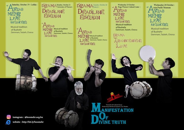 به گزارش صلح خبر، گروه هومهر از روز شنبه، ۲۷ مهرماه به مدت یک هفته در دانشگاه ورشو، شهرداری لوبلین، موزه آسیا و پاسیفیک ورشو، مرکز فرهنگی پراگا در ورشو و صومعه «دومینیکن» شهر لوبلین برنامههای نمایش، عزاداری سنتی بوشهر، نوحهخوانی، مرثیهخوانی و سینهزنی را اجرا خواهد کرد.
