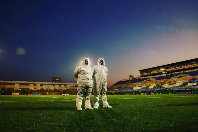 لیگ فوتبال پاراگوئه بعد از تعطیلی ۱۳۵ روزه به دلیل شیوع بیماری کرونا، از این هفته آغاز شد. این ماموران بهداشت که شمایل شان به  فضانوردان می ماند، برای بررسی وضعیت بهداشتی مسابقه بین تیم های اسپورتیو لوکوئنو و الیمپیا به زمین ورزشگاه آمده اند.