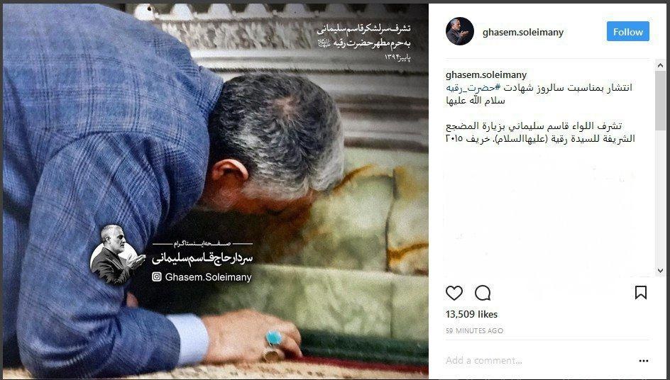 سیاست > نظامی – صفحه اینستاگرام منتسب به سردار قاسم سلیمانی به مناسبت شهادت حضرت رقیه سلامالله علیها تصویری از سردار سلیمانی منتشر کرد.